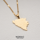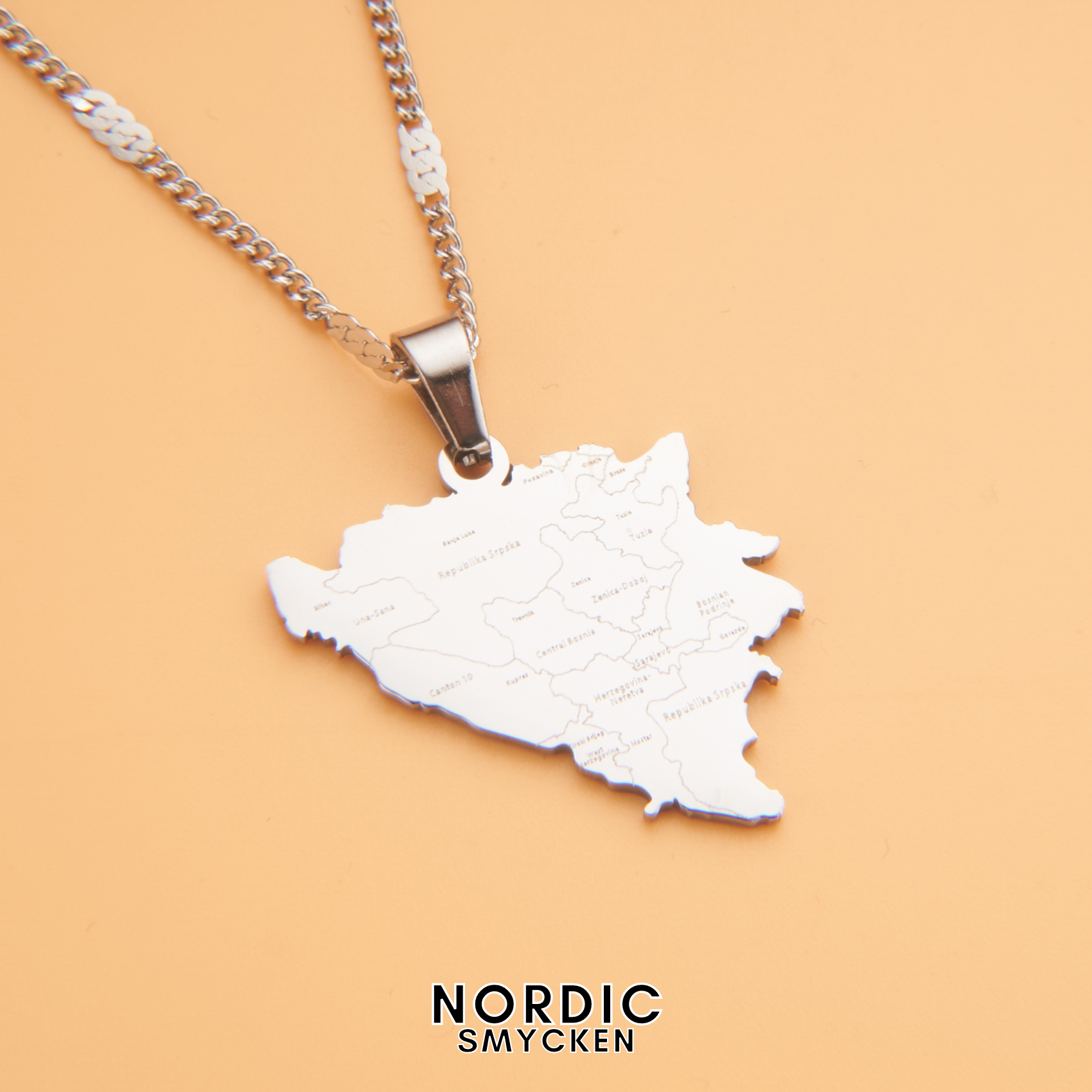 I centrum av detta halsband är ett förtjusande hängsmycke som noggrant avbildar Bosnien-Hercegovinas geografiska karta, komplett med dess städer etsade in för en autentisk känsla. Det är en detaljerad representation som inte bara hyllar landets yttre form utan också dess rika inre liv och de band som sammanlänkar dess invånare.